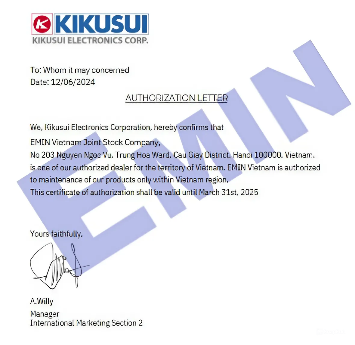 Kể từ tháng 12 năm 2024, EMIN GROUP chính thức trở thành nhà phân phối của KIKUSUI tại Việt Nam. Với vai trò này, EMIN mang đến các thiết bị kiểm tra và đo lường chất lượng cao từ KIKUSUI, bao gồm các dòng sản phẩm như nguồn điện lập trình DC, nguồn AC, tải điện tử, và hệ thống kiểm tra an toàn điện.