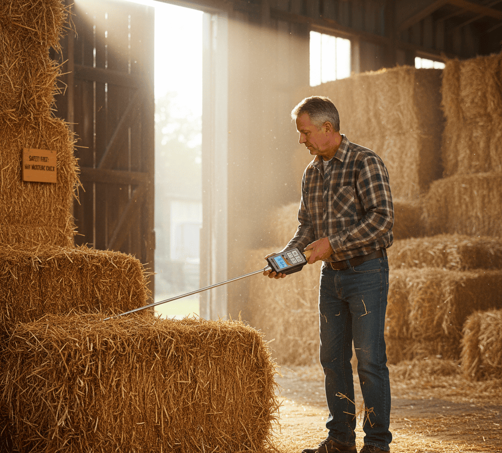 Rơm cỏ sau khi phơi thường khô bên ngoài nhưng phần lõi vẫn có thể giữ hơi ẩm. Khi độ ẩm còn cao, vi sinh vật trong rơm hoạt động và sinh nhiệt, làm rơm đổi màu, giảm chất dinh dưỡng và có nguy cơ gây cháy kho. Để kiểm tra chính xác, cần đo độ ẩm ở phần lõi của các bó rơm hoặc các chùm rơm lớn bằng thiết bị có que cắm sâu. Các dòng như PCE-HMM phù hợp vì đầu dò dài và chuyên dùng cho rơm cỏ. Rơm chỉ an toàn khi độ ẩm đạt khoảng 12 đến 15 phần trăm trước khi bó và đưa vào kho.